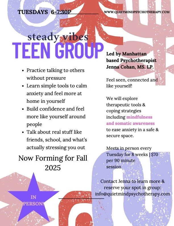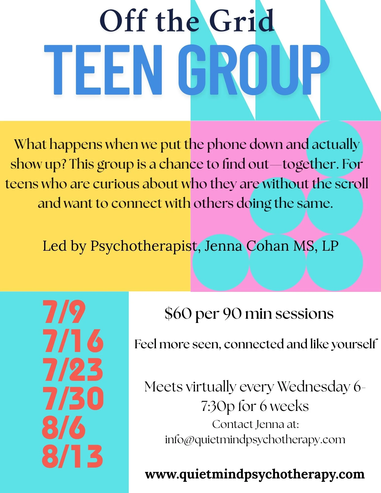 Quiet Mind Psychotherapy offers a range of groups: Trauma Processing, Adoption Issues, Teen Off The Grid (Teens wanting/needing to unplug and be seen without the filter), Teen Steady Vibes (Social Skills, Anxiety, & Mindfulness to name a couple).